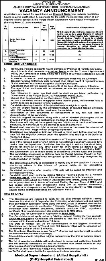 - New / Latest / Recent Advertisements / Current Jobs 2026 Allied Hospital Faisalabad NTS Apply Online Medical Technicians DHQ Hospital